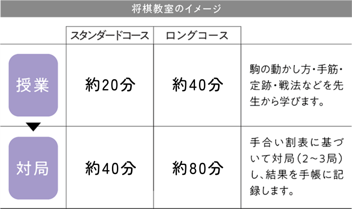 | 指導時間帯 | スタンダードコース 月3回 60分/ロングコース 月3回 120分 月3回の通常授業+年4回の自由対局大会がございます。 |