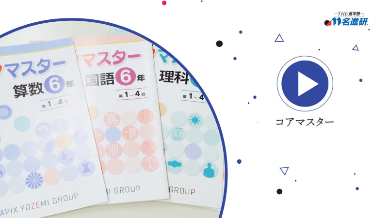 東海中学校・南山中学校女子部・滝中学校など東海地区の難関・有名中学校に、長年多くの合格者を輩出し続けているクラスです。SAPIXの授業をテキスト化した「コアマスター」を教材に採用。名進研のプロ教師による活気あふれる討論式・対話式授業との相乗効果で思考力と記述力を養い、初見問題でも前向きに挑戦できる真の学力を育てます。