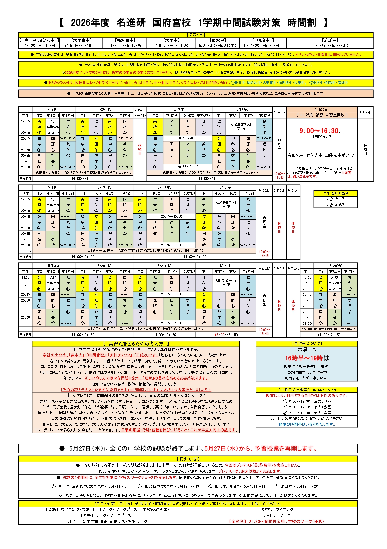 ※中学生は通塾日以外でも定期試験対策を実施します(定期試験対策期間のみ)