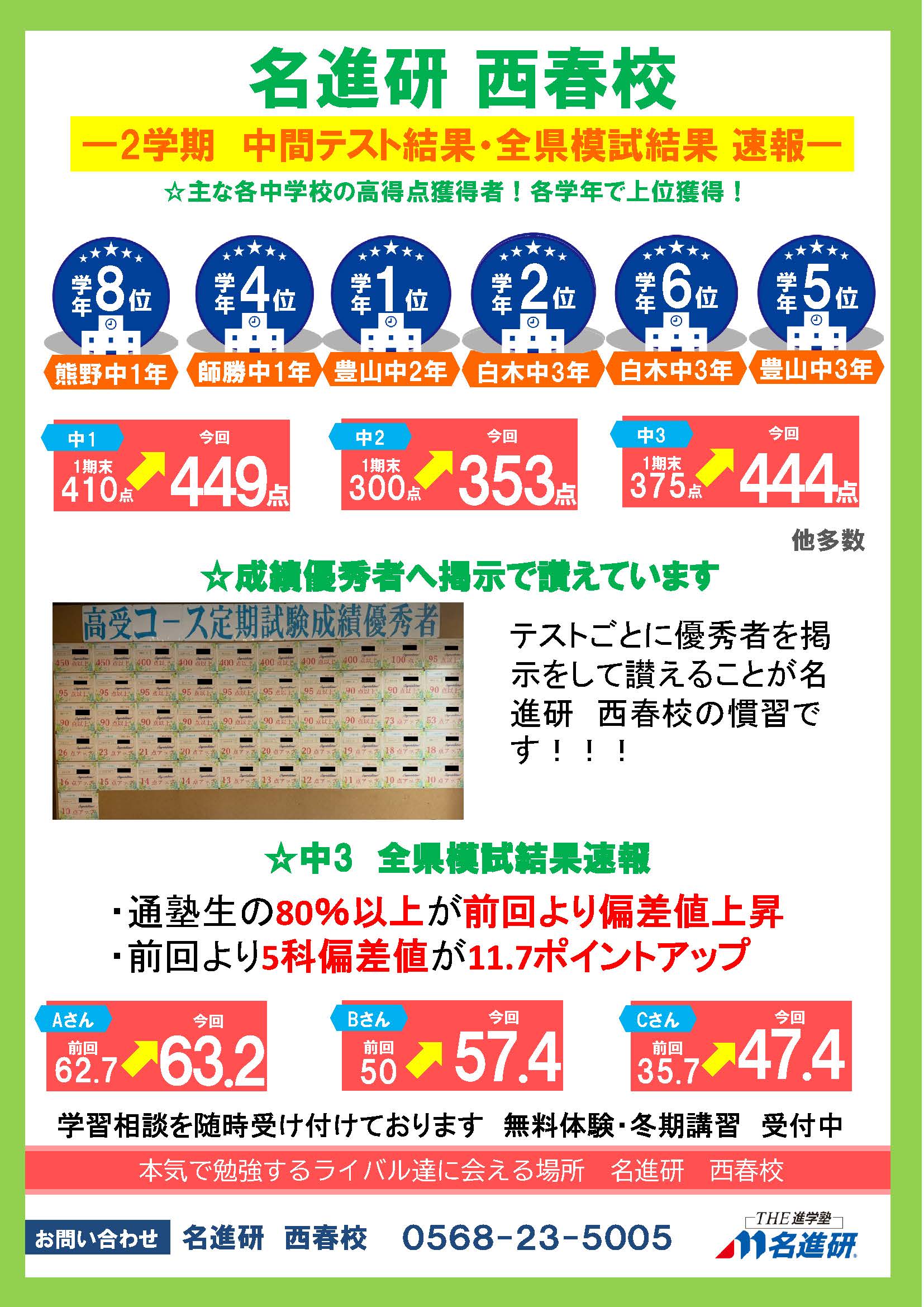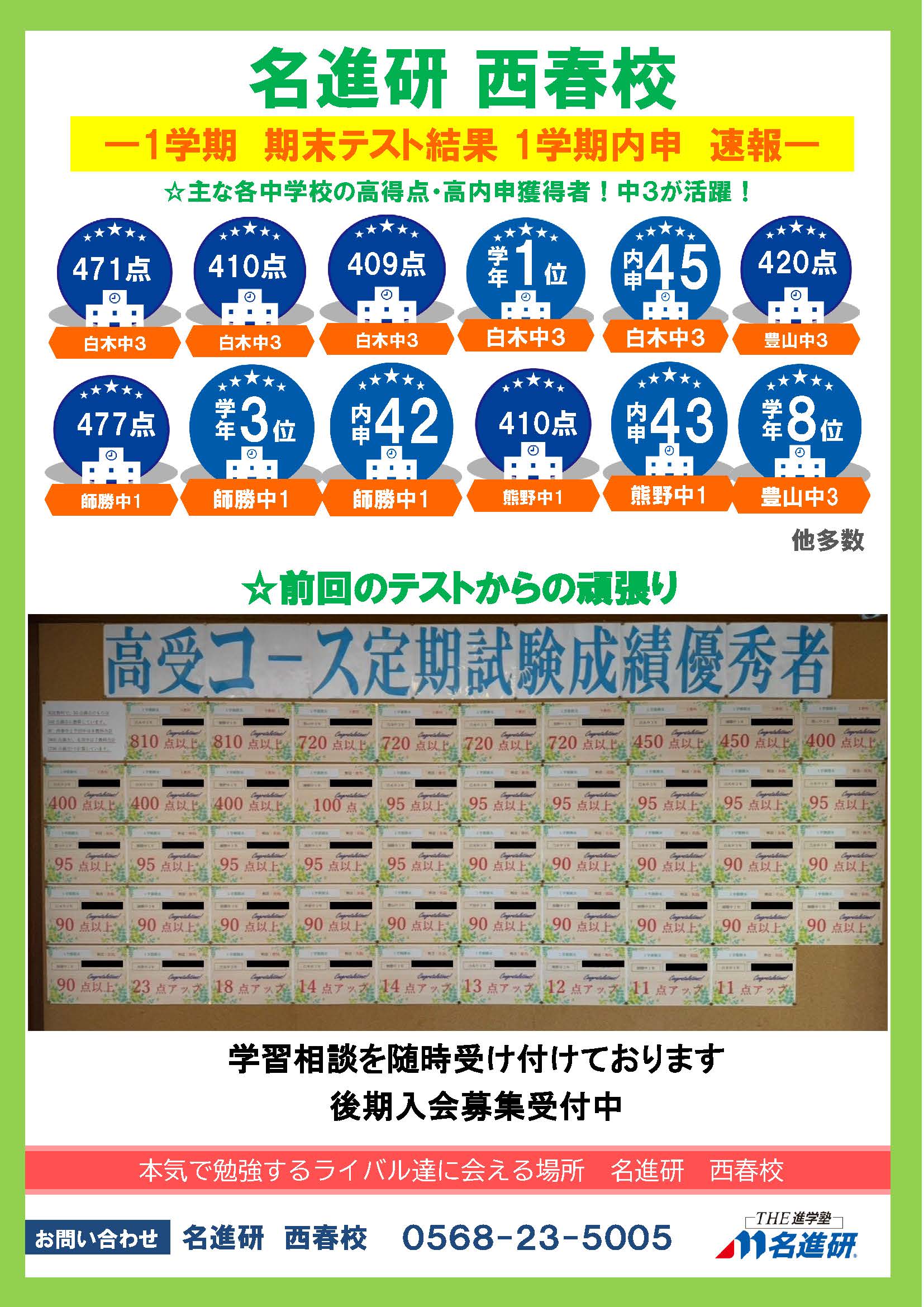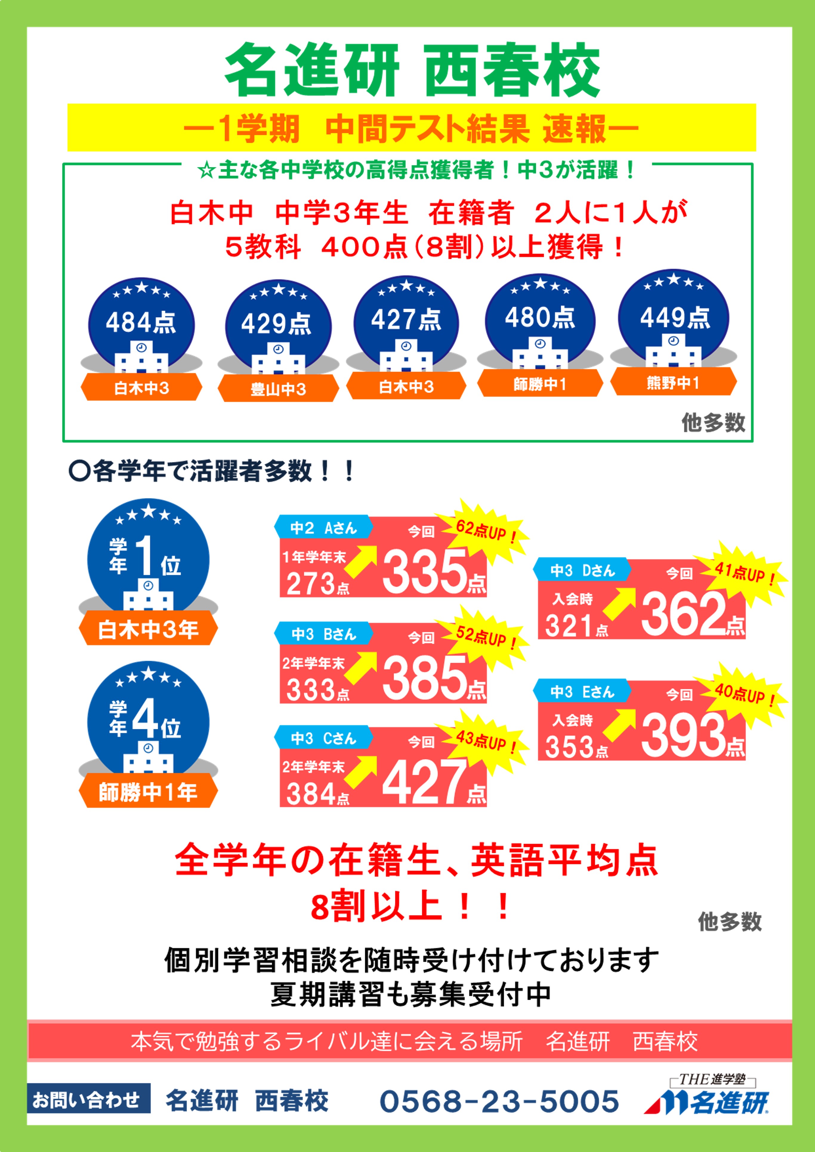 また、男子・女子ともに最難関校へも輩出しており、落ち着いた環境の中でお子さまの志望校合格に向けて、名進研西春校に通って良かったと思っていただける塾であるよう精一杯サポートさせていただきます。