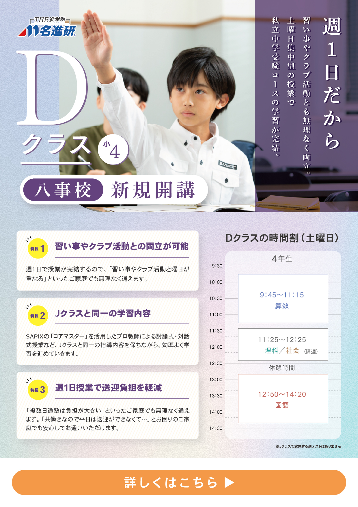 | Dクラス | 小4 | 算国理社 | 週1日 | 土/9:45~14:20 | 26,620円 |